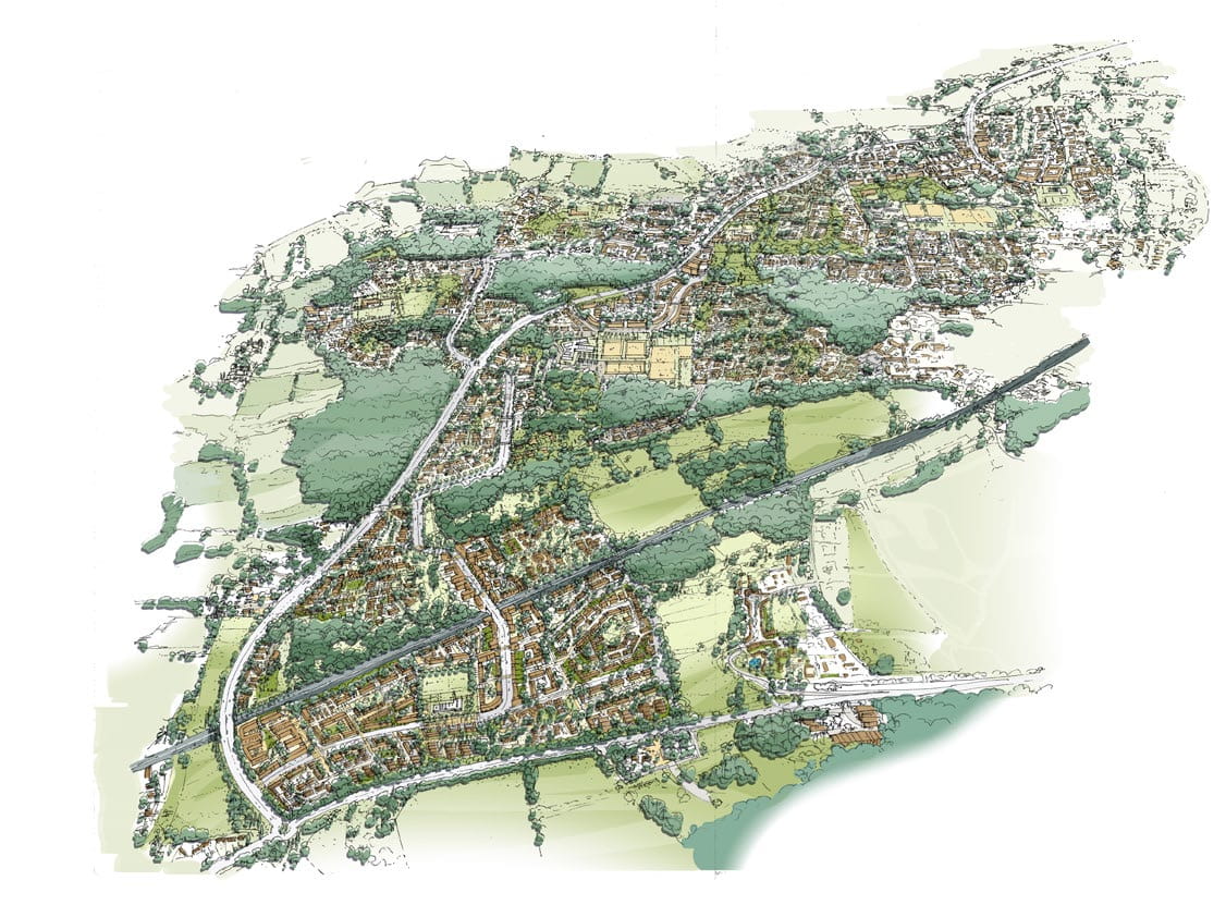 This includes taking note of Gatwick Airport’s planned expansion, the proposed West Crawley Relief Road, a complex flood relief strategy, and protecting the setting of old Ifield village. The proposals are for: over 3000 homes (of which 40% will be affordable); 1000 jobs; 3 schools and a local centre; set in over 50 % open space. Particular care has been taken to protect the setting of Ancient Woodland and other important wildlife sites.